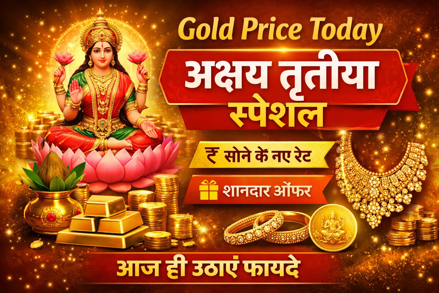 अक्षय तृतीया हिंदू धर्म का बेहद शुभ और पवित्र पर्व माना जाता है। इस दिन सोना खरीदना शुभ माना जाता है, इसलिए हर साल लाखों लोग Akshay Tritiya Gold Purchase करते हैं। अगर आप भी आज सोना खरीदने की सोच रहे हैं, तो पहले जान लीजिए Gold Price Today, लेटेस्ट ऑफर और कौन-सा गोल्ड खरीदना रहेगा फायदेमंद।
